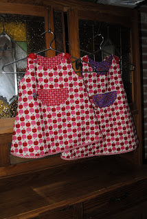 Het stofje met de paddestoelen komt van bij Noeks en dat met de appeltjes kocht mijn nicht bij bambiblauw.